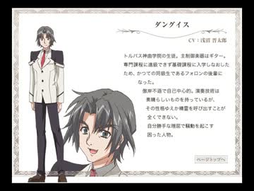 タタラ・フォロン cv小橋 達也 この物語の主人公で、トルバス神曲学院の学生。 驚異的な集中力の持ち主で潜在能力は高いが、反面、安定した神曲が奏でられない心の弱さがある。タタラ・フォロン 神谷 浩史 コーティカルテ・アパ・ラグランジェス 戸松 遥 ユギリ・ペルセルテ 水樹 奈々 ユギリ・プリネシカ 佐藤 利奈 ツゲ・ユフィンリー 川澄 綾子 サイキ・レンバルト 小西 克幸タタラ・フォロン cv小橋 達也 この物語の主人公で、トルバス神曲学院の学生。 驚異的な集中力の持ち主で潜在能力は高いが、反面、安定した神曲が奏でられない心の弱さがある。